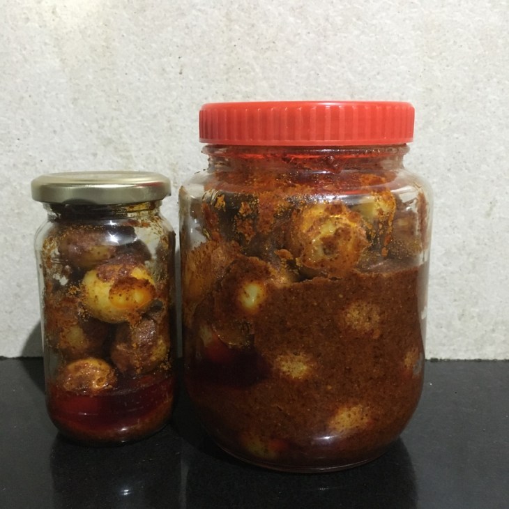I learnt this recipe from mom, who instructs us over the call even today. While this recipe is getting documented, will still call mom over phone as I make this year after year. The joy of mom instructing over phone is at another level. Its a quick and easy recipe. It is a ready to eat pickle I.e. one need not wait for the fruit to pickle and soak up the spices and these are absorbed readily. However this version doesn’t stay for longer periods and has shelf life of few weeks when left out or can stay good for few months when refrigerated.
