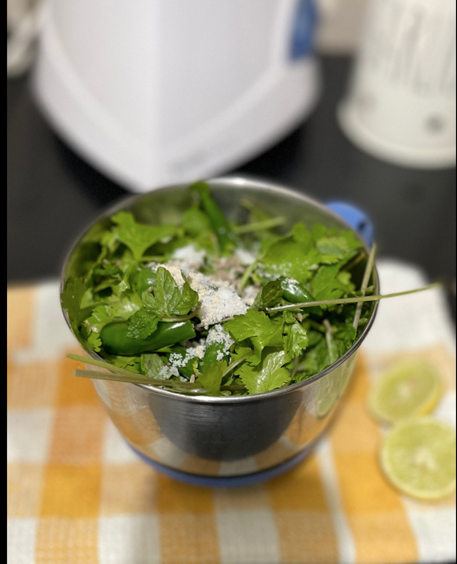 - Now in a blender add the greens, chillies, ginger, salt, Jeera, hing and squeeze the juice of one full lemon.