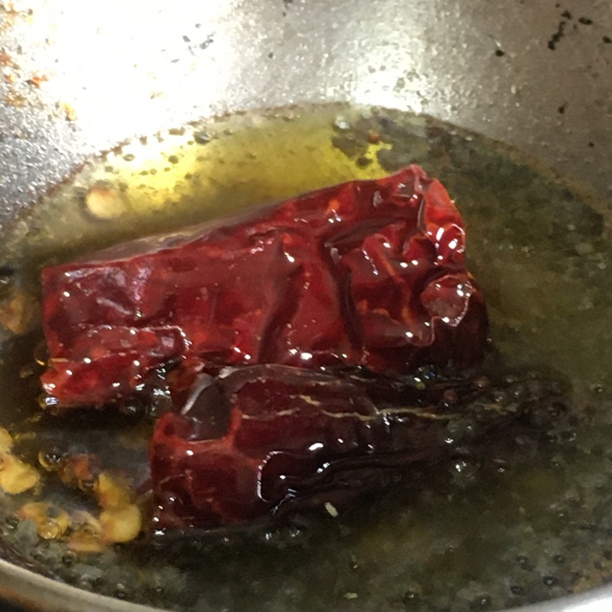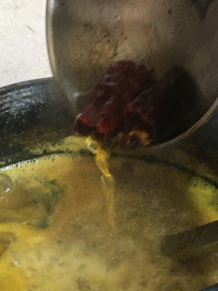 - In a small kadhai or skillet. Heat the oil and once hot add mustard, methi seeds and halved dried red chillies.
